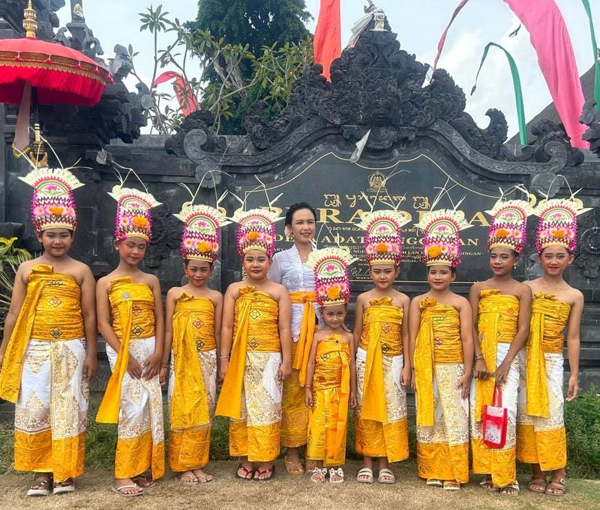 Kamen putih kuning, kemben, selendang, sabuk prada, gelungan tinggi dengan hiasan bunga, kalung, anting, gelang, bokor atau canang sebagai persembahan.