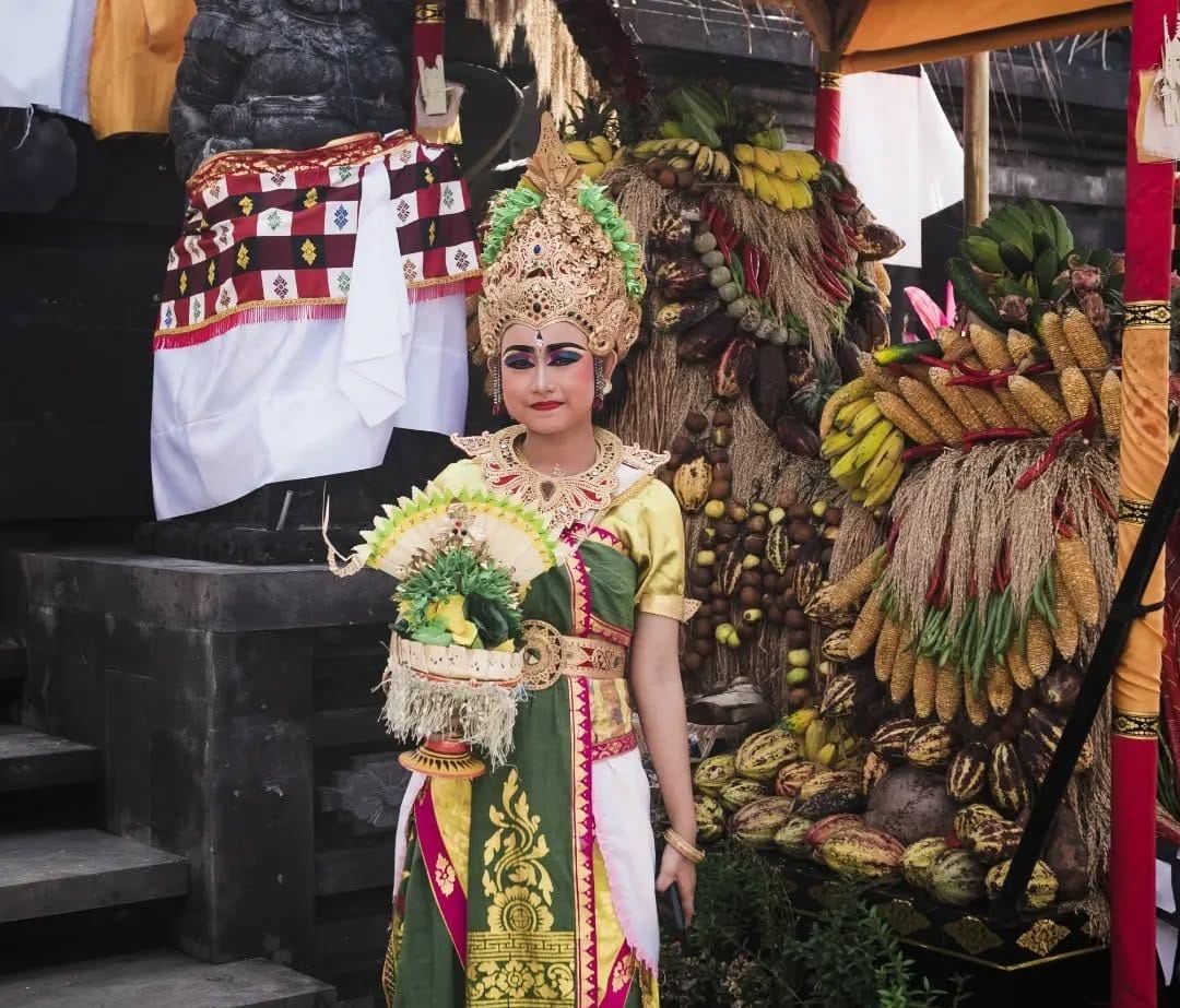 Kamen, kemben, selendang, sabuk prada, gelungan dengan hiasan bunga sandat, kalung, anting, gelang, bokor kecil berisi bunga.